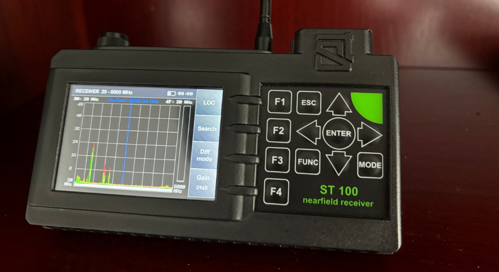 ST-100 es un dispositivo transceptor que detecta la baja frecuencia generada por dispositivos electrónicos en funcionamiento.