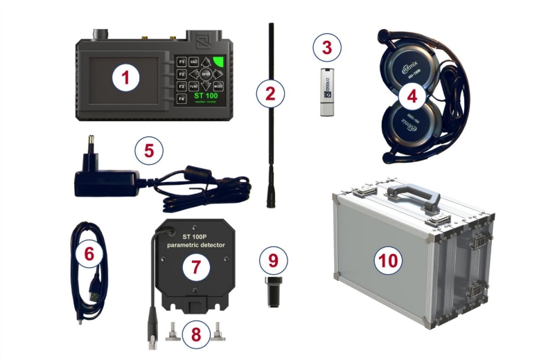 Dispositivo, antena, USB, Auriculares, cargador, cable usb, Detector paramétrico ST 100, antenas, maletín resistente.