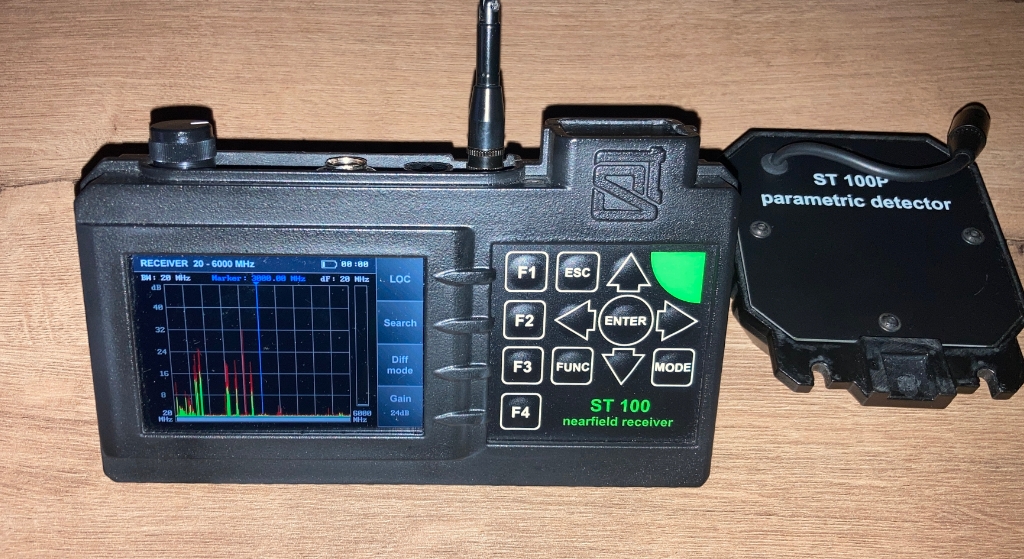 ST-100 es un dispositivo transceptor que detecta la baja frecuencia generada por dispositivos electrónicos en funcionamiento.